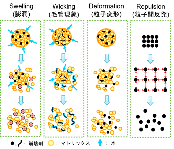 崩壊剤の崩壊パターンは膨潤(swelling)と毛管現象(wicking)、粒子変形(Deformation)、粒子間反発(Repulsion)の