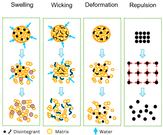 The disintegration pattern of disintegrants can be roughly divided into four types: swelling, wicking, particle deformation, and inter-particle repulsion.